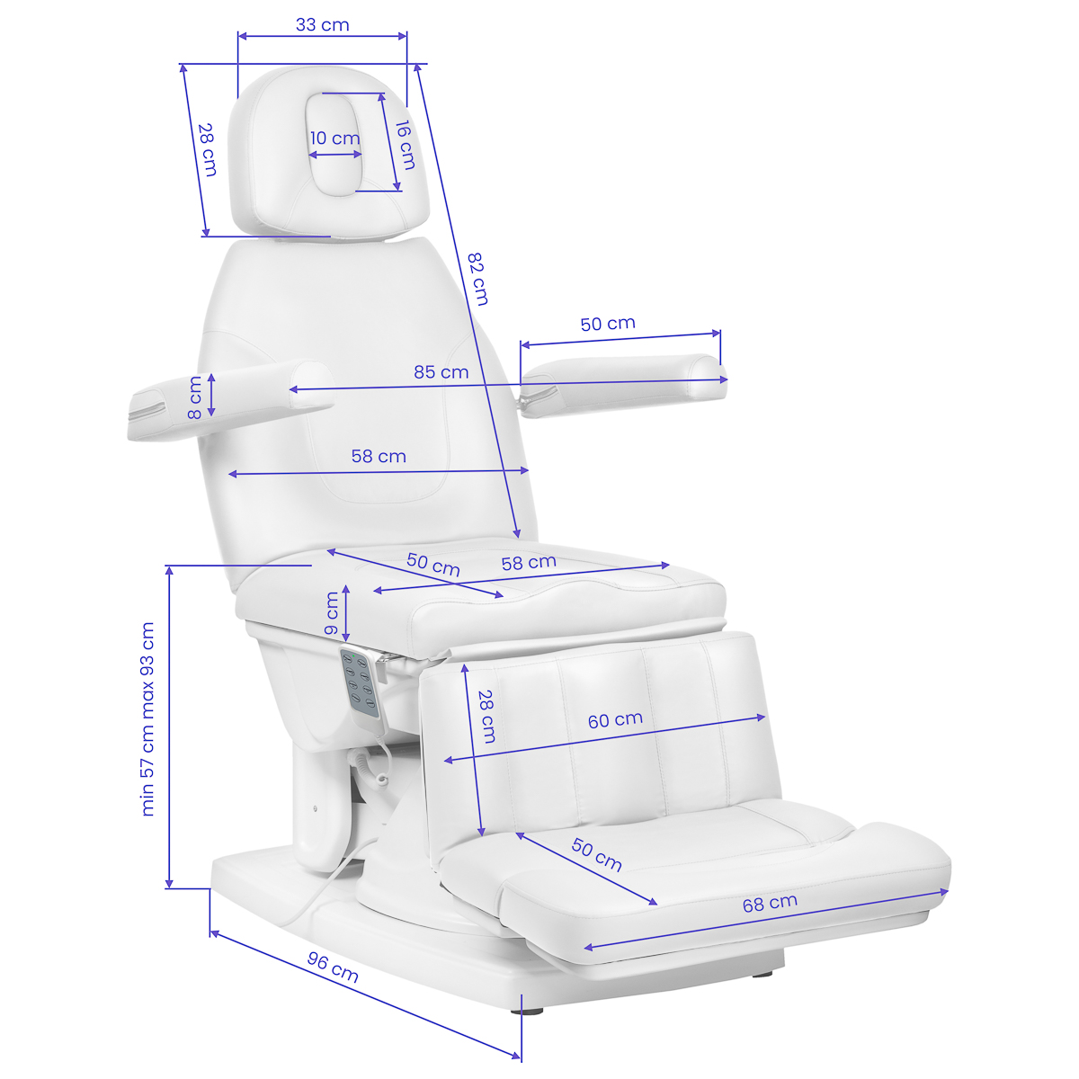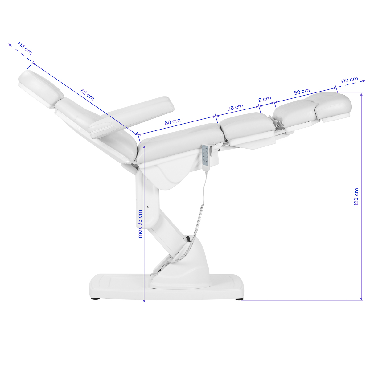 Die speziell entwickelte Fußstütze erleichtert Pediküre- und Podologiebehandlungen erheblich. Sie ist breit und stabil und ihr Winkel lässt sich stufenlos per elektrischer Fernbedienung verstellen. Diese Lösung ermöglicht eine bequeme Beinauflage und eine korrekte Positionierung und erhöht so den Komfort sowohl für den Kunden als auch für den Behandler. Die ausziehbare Fußstütze macht den Stuhl ideal für größere Benutzer und bietet ihnen ausreichend Halt. Das abnehmbare Ende der Fußstütze ermöglicht dem Behandler uneingeschränkten Zugang zu Füßen und Zehen und sorgt so für mehr Komfort und Präzision bei anspruchsvollen Behandlungen. Bei maximaler Sitzhöhe, ausgezogener Fußstütze und geneigter Liegefläche erreicht der Stuhl eine Höhe von ca. 120 cm, was präzises Arbeiten bei podologischen Spezialbehandlungen zusätzlich erleichtert. Der ergonomisch geformte Sitz gewährleistet eine bequeme und stabile Körperhaltung während der Behandlung. Das Design ermöglicht es, den Stuhl in eine Liegeposition zu bringen. Die praktische Öffnung in der Kopfstütze, die diskret unter dem Kissen verborgen ist, macht ihn ideal für Massagen sowie Rücken- und Körperbehandlungen. Die ausziehbare Kopfstütze erlaubt die Anpassung des Stuhls an die Körpergröße des Kunden und die Art der Behandlung. Stabile Armlehnen bieten bequeme Unterstützung, und die Möglichkeit, sie nach hinten zu klappen, erleichtert den Einstieg. Langlebigkeit und minimalistisches Design: Die weiche Schaumstoffpolsterung und der Bezug aus weichem, angenehm anzufassendem, mattem Kunstleder in Weißtönen garantieren Komfort und einfache Reinigung. Das Material ist feuchtigkeitsbeständig, und die sorgfältig gearbeiteten Nähte unterstreichen den eleganten Charakter des Möbelstücks. Die solide Konstruktion gewährleistet Stabilität und Langlebigkeit, während das minimalistische Design in klassischen Farben den Stuhl zur perfekten Ergänzung moderner Inneneinrichtungen macht.