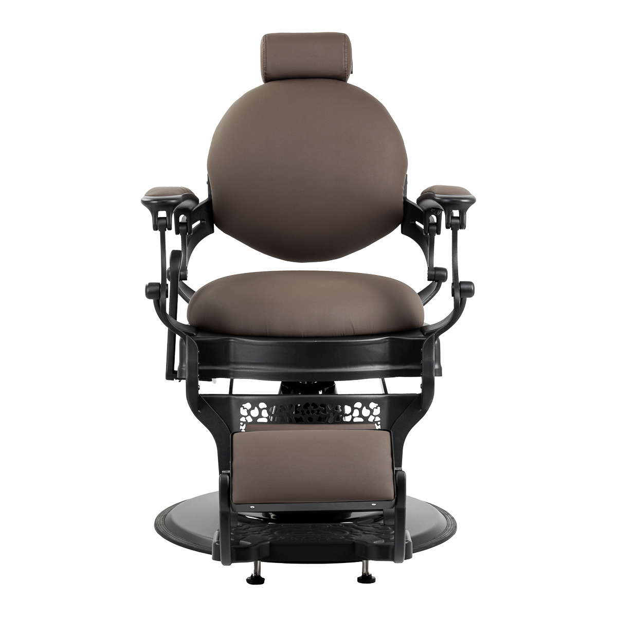 Eine stabile Basiskonstruktion gewährleistet Stabilität und hohen Sitzkomfort. Die Sitzpolsterung aus strapazierfähigem, formbeständigem Schaumstoff und der Bezug aus angenehm weichem Kunstleder mit matter Oberfläche gewährleisten langjährige Haltbarkeit und hohen Sitzkomfort. Die verwendeten Materialien machen das Möbelstück zudem feuchtigkeitsbeständig, langlebig und pflegeleicht. Der Bezug in Brauntönen und die verzierte Fußstütze verleihen ihm einen einzigartigen Charakter. Der Stuhl mit seinem markanten Design im Vintage-Stil fügt sich perfekt in die Atmosphäre von Friseursalons ein und unterstreicht deren einzigartiges Ambiente.