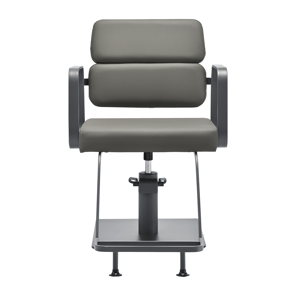 Die Füllung aus strapazierfähigem, formstabilem Schaumstoff und der Bezug aus angenehm weichem Kunstleder gewährleisten die Langlebigkeit und den hohen Nutzungskomfort der Möbel. Zudem sind die Möbel feuchtigkeitsbeständig, strapazierfähig und leicht zu reinigen. Der graue Bezug verleiht ihnen einen einzigartigen Charakter. Das Gerät zeichnet sich durch ein modernes Design aus, wodurch der Stuhl in vielen professionellen Salons hervorragend aussieht.