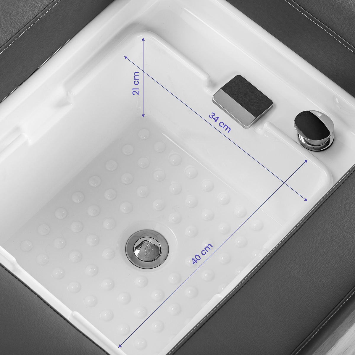 Die verstellbare Kopfstütze mit ausziehbarem und einstellbarem Neigungswinkelsorgt für eine optimale Anpassung an den Benutzer und erhöht so den Komfort während der Behandlungen. Das Set beinhaltet ergonomische Kissen, darunter eine Kopfstütze mit Gesichtsöffnung, die neben Kopfhautbehandlungen auch Massagen sowie verschiedene Körper- und Gesichtsbehandlungen ermöglicht. Das integrierte Becken erweitert die Funktionalität der Liege und ermöglicht Fußpflegebehandlungen, einschließlich Pediküre. Diese Lösung verstärkt das Entspannungsgefühl und ermöglicht ein noch umfassenderes Behandlungsangebot. Diese praktischen Eigenschaften machen die Liege zu einem vielseitigen Gerät für Kosmetik- und Wellnesssalons und gewährleisten sowohl den Komfort der Kunden als auch die Wirksamkeit der durchgeführten Behandlungen.