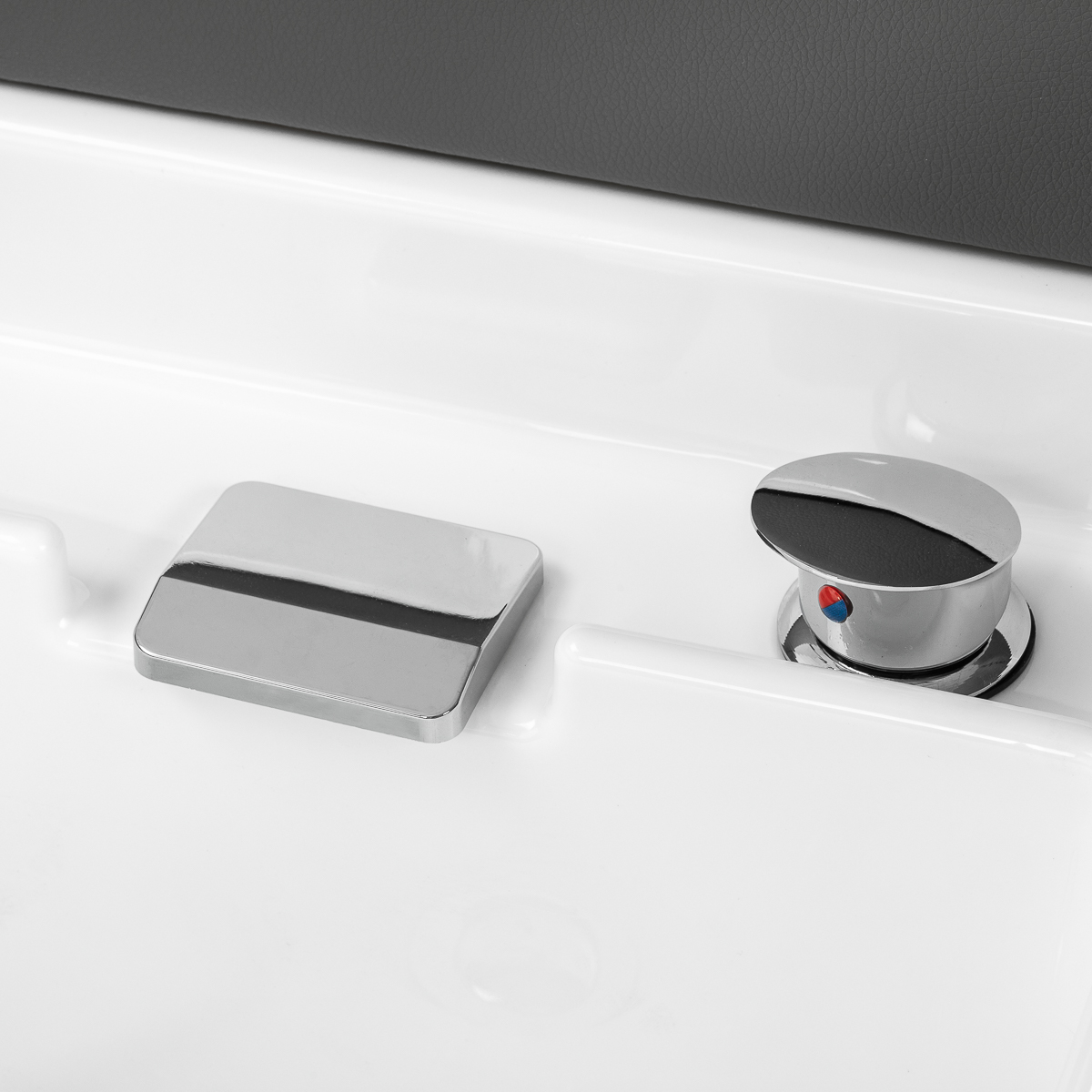 Die Wascheinheit ist mit einer Mischbatterie ausgestattet, die eine einfache Temperaturregelung nach Kundenwunsch ermöglicht. Eine praktische Halterung für den Duschkopf erleichtert die Arbeit, während ein Stöpsel mit speziellem Sieb die Wassermenge reguliert und so hohe Hygienestandards im Salon gewährleistet. Der Wasseranschluss befindet sich innen unter dem Becken und hinten unter der Duschwanne und verdeckt die Installation ästhetisch. Die ergonomisch geformte Liege bietet Komfort und optimale Unterstützung während der Behandlungen, und der mitgelieferte Hocker erhöht den Komfort des Personals. Die Kombination aus Funktionalität und Komfort macht diese Waschstation zu einem vielseitigen Gerät für Friseursalons und Spas.