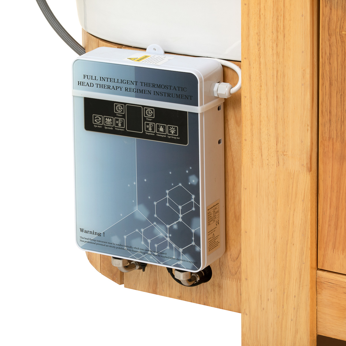 Das intuitive Touchpanel ermöglicht die volle Kontrolle über die Behandlungsparameter und sorgt für eine einfache Anwendung. Es erlaubt die Einstellung von Behandlungszeit und Wassertemperatur sowie die Echtzeitüberwachung der Einstellungen. Über das Panel kann außerdem die Lichttherapie aktiviert werden – das Licht im Becken schafft eine entspannende Atmosphäre und verstärkt das luxuriöse Behandlungserlebnis. Zusätzlich ist das Dampftherapiegerät mit einer Fernbedienung für bequeme Bedienung ausgestattet.