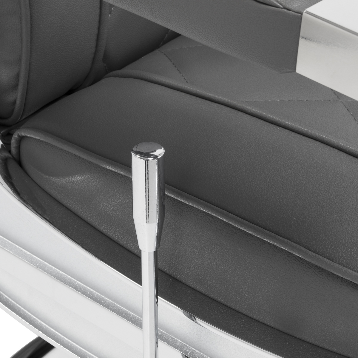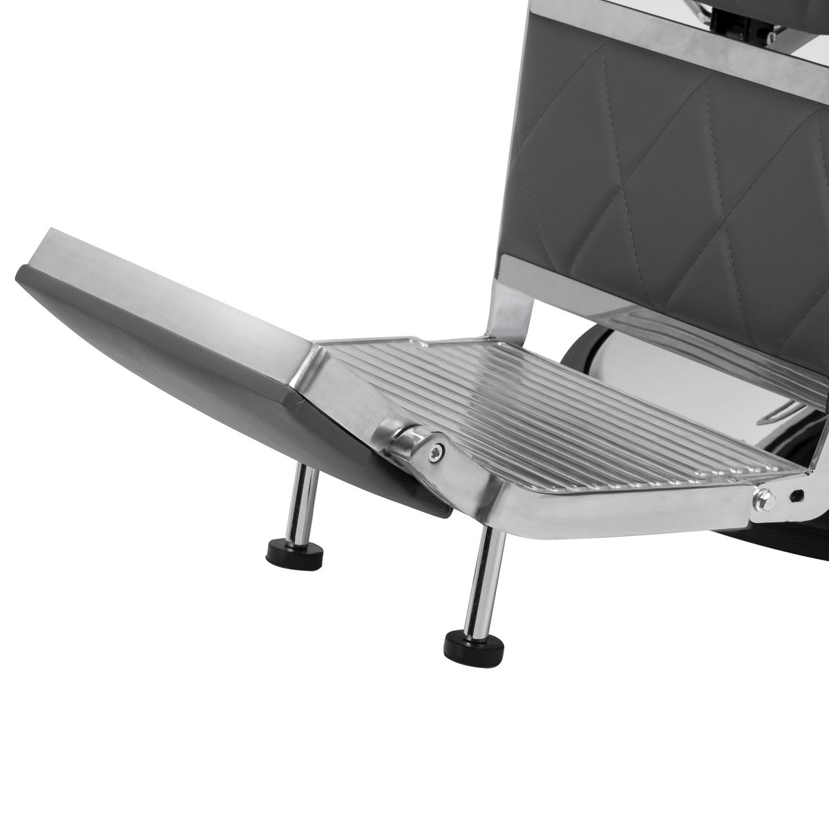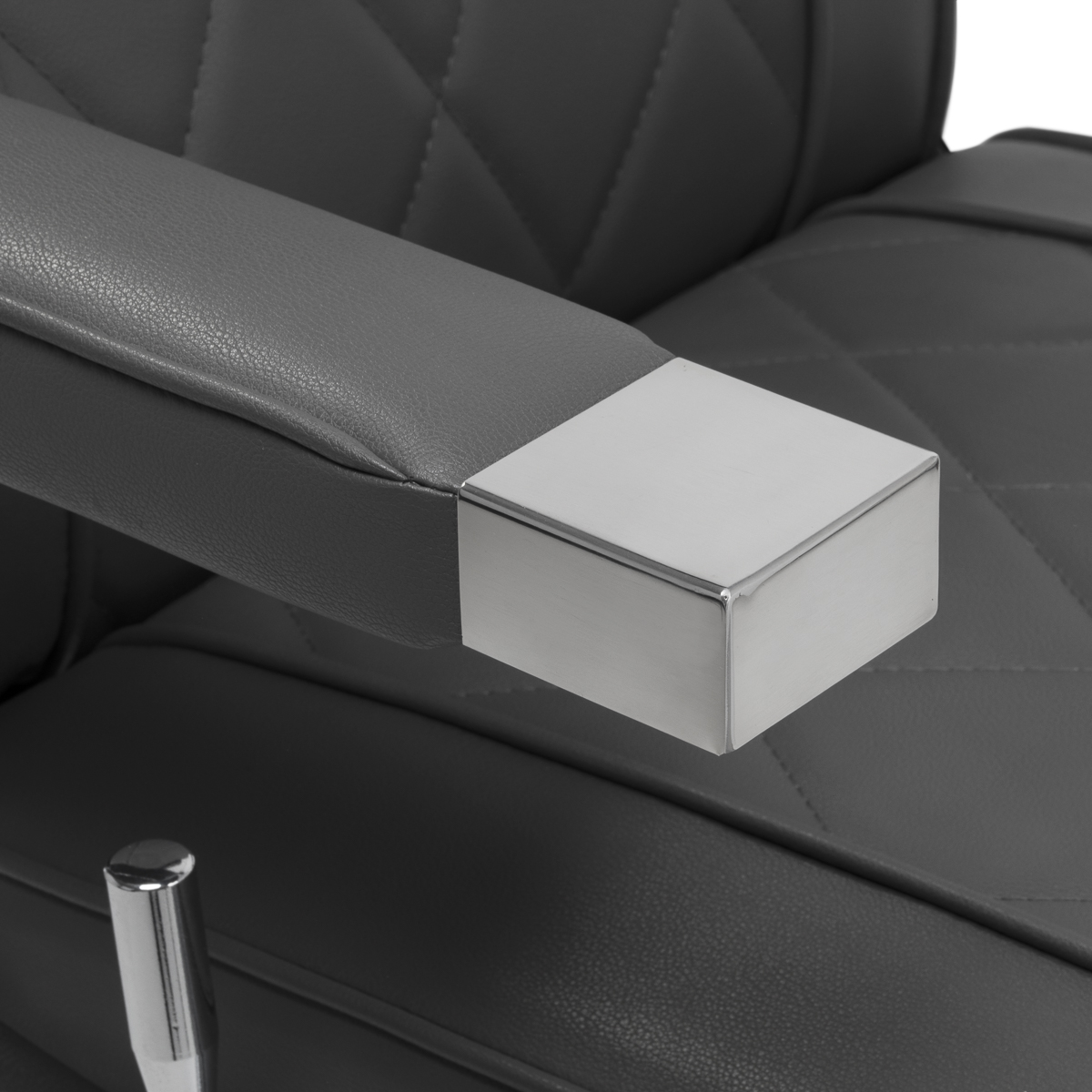 Die stabile, runde Fußkonstruktion des Stuhls gewährleistet Stabilität und hervorragenden Sitzkomfort. Die Sitzpolsterung aus formbeständigem Schaumstoff und der Bezug aus weichem Kunstleder mit matter Oberfläche garantieren Langlebigkeit und Komfort auch bei längerem Gebrauch. Stilvolle Ziernähte verleihen dem Stuhl Charakter und erinnern an Automobildesign, was seine elegante Optik unterstreicht. Diese Eigenschaft macht den Stuhl außerdem feuchtigkeitsbeständig, langlebig und leicht zu reinigen. Die graue Polsterung verleiht dem Stuhl einen einzigartigen Charakter, und sein minimalistischer Stil sorgt dafür, dass er sich nahtlos in die Einrichtung jedes Friseursalons einfügt.