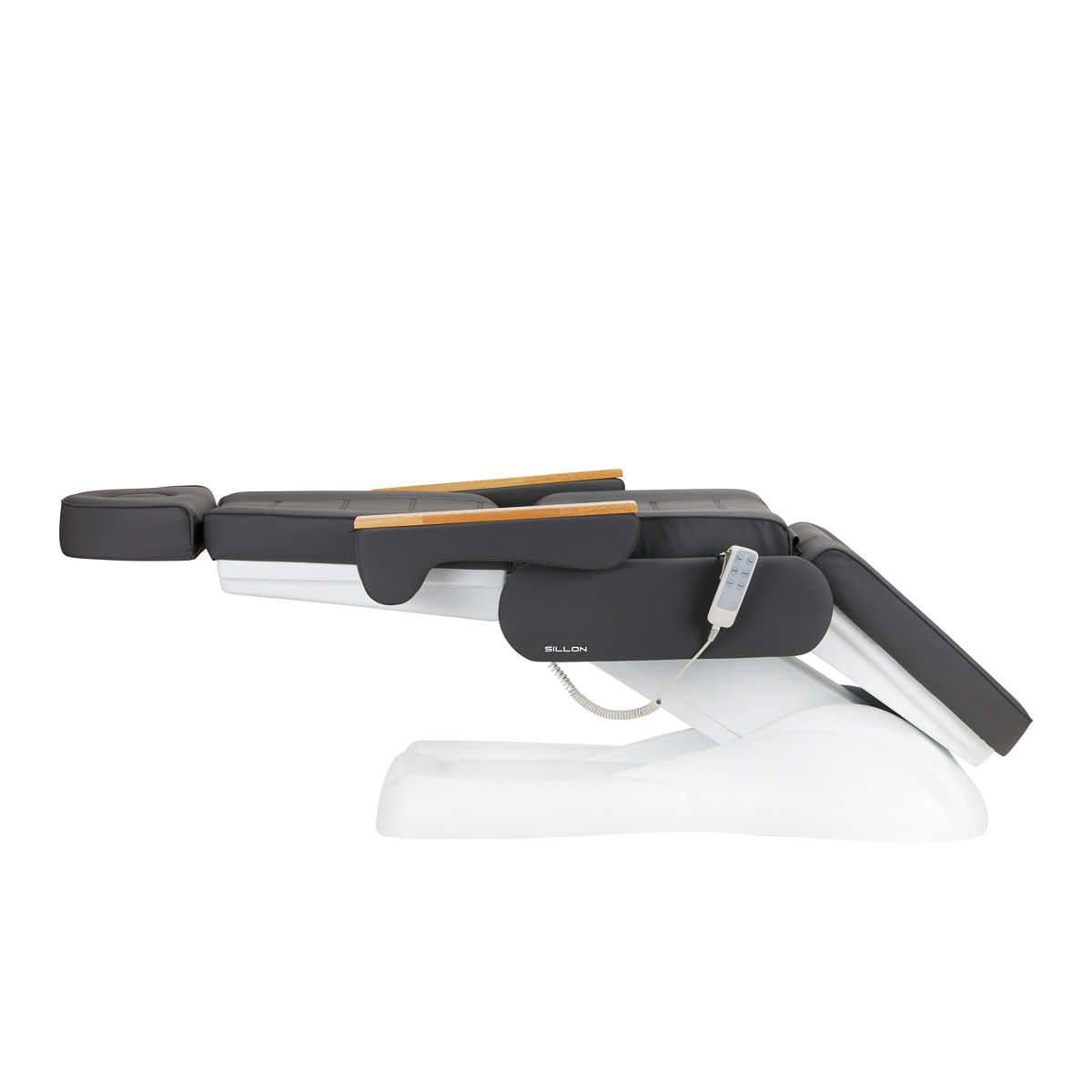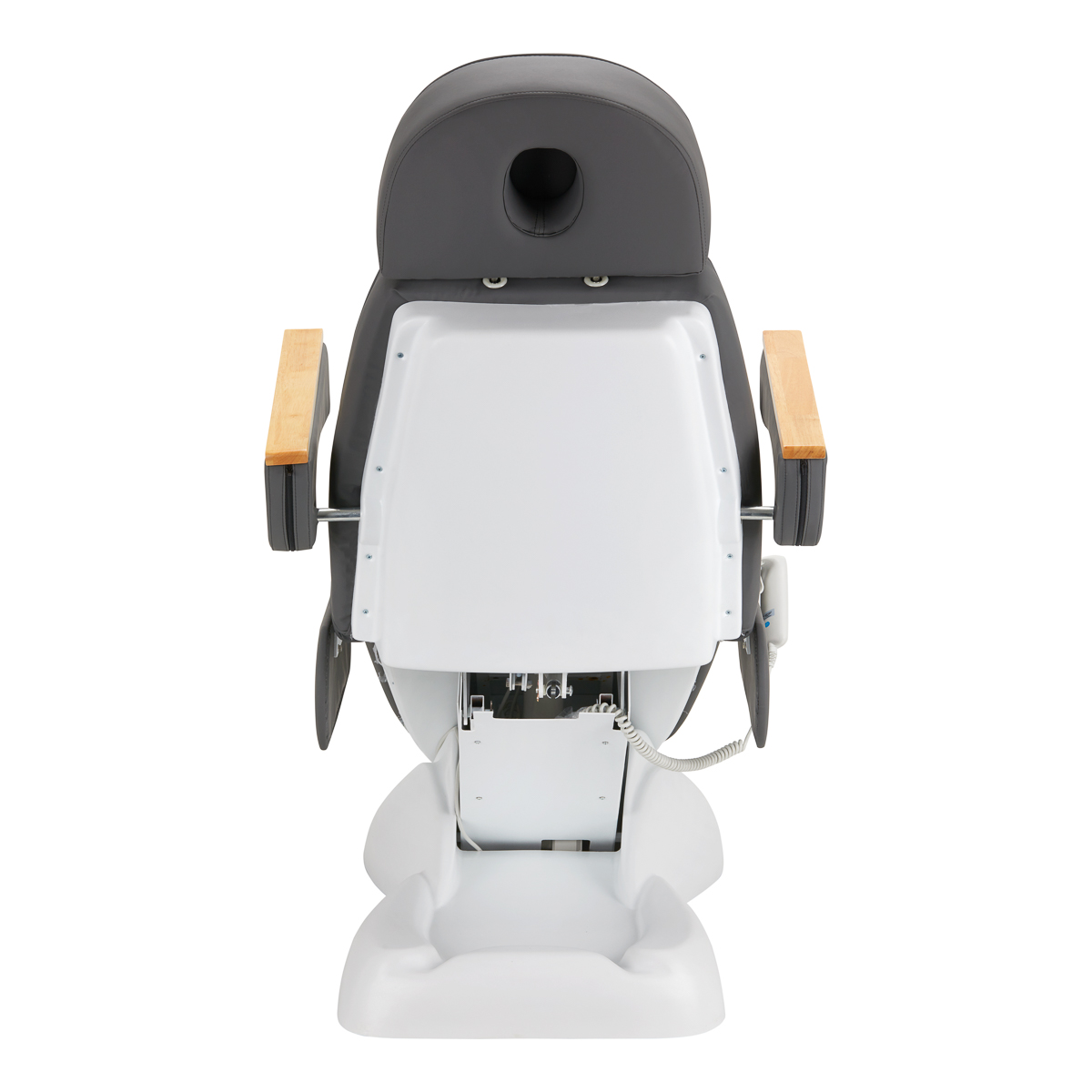 Mithilfe einer intuitiven Fernbedienung lässt sich der Stuhl stufenlos in drei Ebenen verstellen – Höhe und Winkel von Rückenlehne und Fußstütze sind verstellbar. Dies ermöglicht es Ihnen, die Position je nach der gerade durchgeführten Behandlung flexibel anzupassen, was sowohl den Komfort des Anwenders als auch des Behandlers beeinflusst.