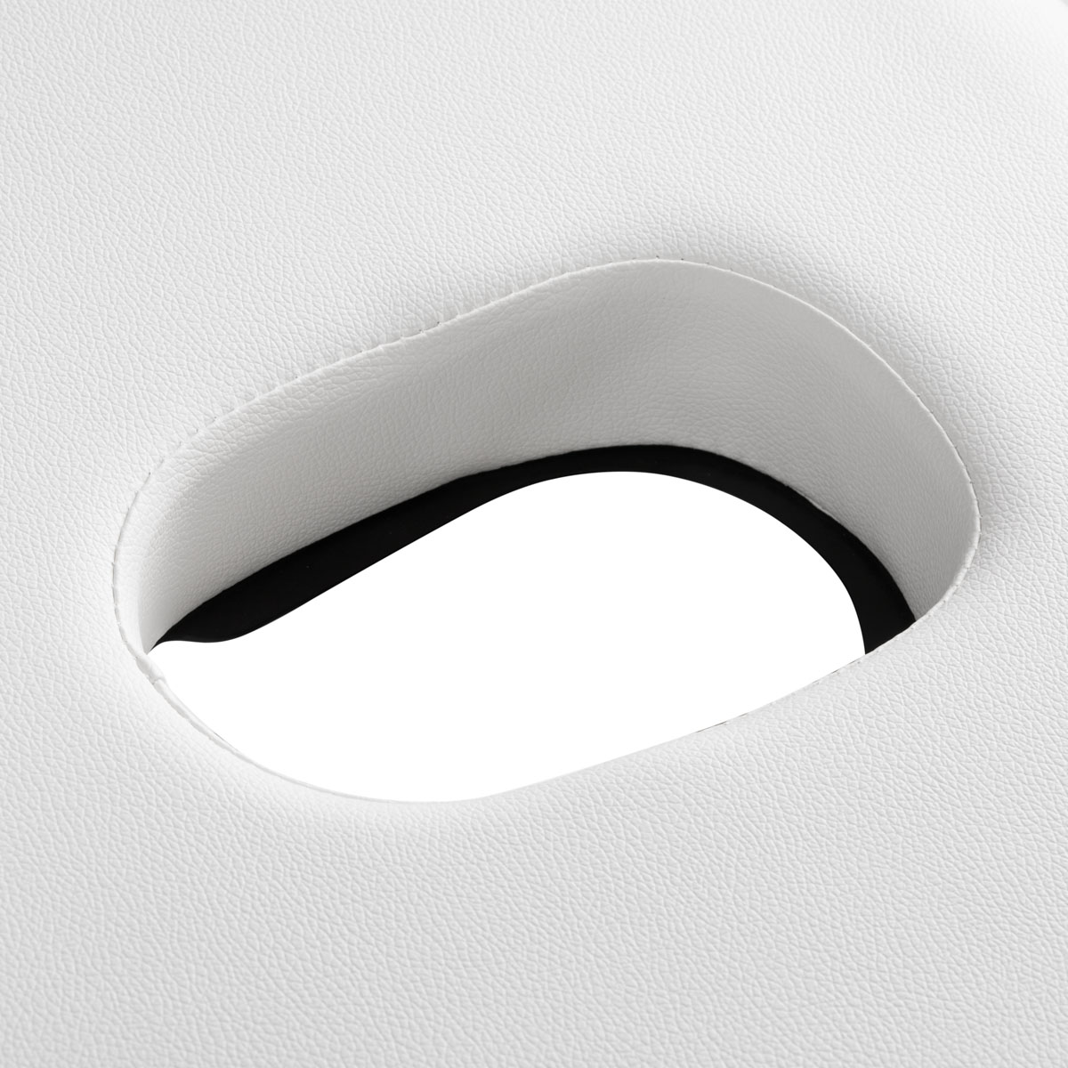 Für maximalen Komfort kann der Benutzer seinen Kopf auf der ergonomischen Kopfstütze ablegen, die im Set enthalten ist. Diese ist leicht verstellbar – der Winkel lässt sich in zwei Ebenen anpassen, sodass die Position präzise auf die Bedürfnisse des Benutzers und die Art der Behandlung abgestimmt werden kann. Für die Rückenlage kann die Kopfstütze entfernt werden; stattdessen wird eine spezielle Öffnung in der Liegefläche verwendet. Wenn die Öffnung nicht benötigt wird, kann sie mit dem beiliegenden Stopfen verschlossen werden, wodurch die Oberfläche wieder ein ästhetisches und einheitliches Erscheinungsbild erhält.