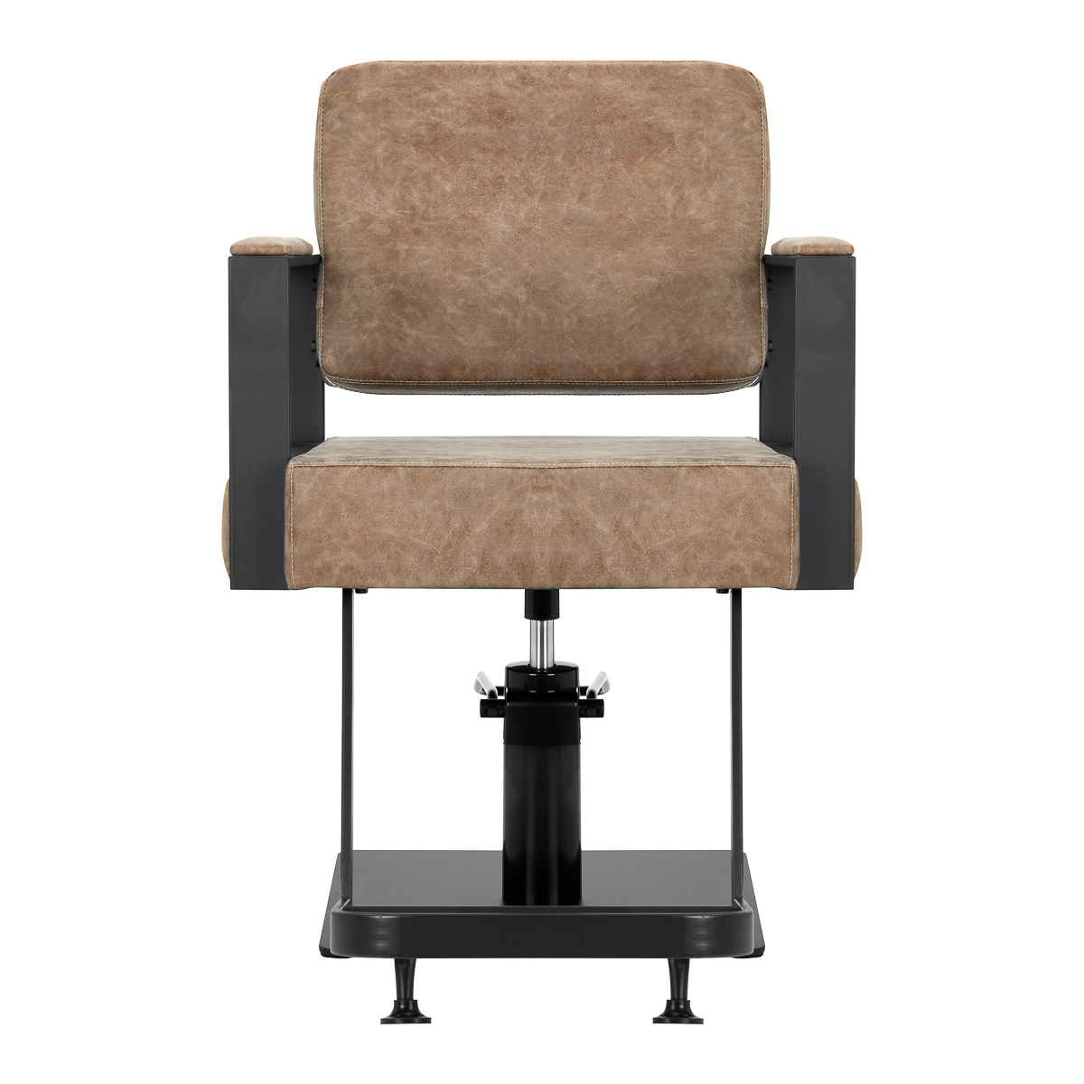 Die Ausstattung des Stuhls mit einem Fully rotating mechanism macht die Arbeit des Friseurs effizienter und komfortabler. Der stabile, flache, quadratische Fuß garantiert Standfestigkeit während der Benutzung. Die matte, glatte Oberfläche verleiht dem Element ein elegantes Aussehen und erleichtert die Reinigung. Ein bequemer Sitz mit Schaumstoffpolsterung sorgt für hohen Komfort, auch bei mehrstündigen Behandlungen. Geometrische, teilweise gepolsterte Armlehnen ermöglichen die korrekte Positionierung der Schultern des Kunden – so wird verhindert, dass er den Kopf in die Schultern sinken lässt oder zusammensackt – was präzise Behandlungen, einschließlich Haarschnitte, deutlich erleichtert. Funktionale Möbel im Loft-Stil. Die Polsterung aus strapazierfähigem, formstabilem Schaumstoff und der Bezug aus angenehmem Kunstleder mit spezieller Struktur gewährleisten die Langlebigkeit und den hohen Nutzungskomfort der Möbel. Zudem sind die Möbel feuchtigkeitsbeständig, strapazierfähig und leicht zu reinigen. Brauntöne und interessante visuelle Elemente in Schwarz verleihen ihnen einen einzigartigen Charakter. Das Möbelstück zeichnet sich durch ein modernistisches Design aus, wodurch der Stuhl in vielen modern eingerichteten Salons hervorragend zur Geltung kommt.