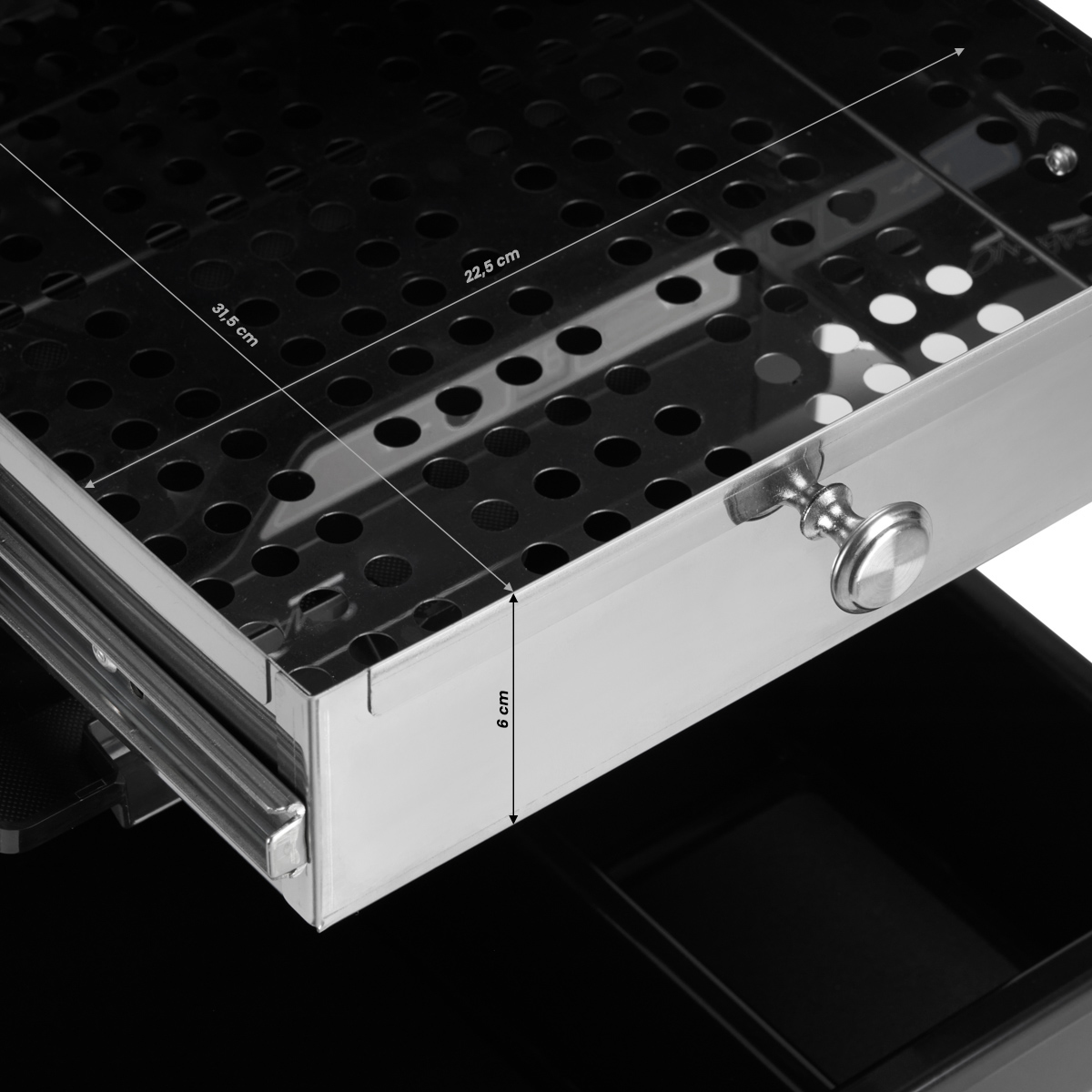 The professional Friseurhelfer Gabbiano 68UV mit UV-Sterilisator ist ein äußerst nützliches Element der Salonausstattung, das die Arbeit verbessert und für Ordnung und Organisation am Arbeitsplatz sorgt. Dank der praktischen Anordnung der Produkte sind die wichtigsten Utensilien stets griffbereit. Die geschlossene Rückwand verhindert, dass die Schubladen versehentlich in die andere Richtung herausgezogen werden und die darin befindlichen Utensilien beschädigt werden. Der geräumige Organizer ist mit einem Set von Aufbewahrungsschalen ausgestattet, die für Ordnung am Arbeitsplatz sorgen und die für die Arbeit des Friseurs notwendigen Werkzeuge übersichtlich sortieren. Das Set umfasst sechs Behälter: zwei ohne Fächer, zwei mit Fächern und zwei schmale und tiefe. Die Anordnung im Organizer lässt sich nach Belieben verändern, und eine große Auswahl an verschiedenen Schubladentypen ermöglicht es Ihnen, die Utensilien individuell zu sortieren. Zusätzlich können die beiden tiefsten Küvetten an den Seiten des Helfers in unterschiedlichen Höhen positioniert werden, sodass sich die darin befindlichen Utensilien immer auf der richtigen Höhe befinden. Tägliche Trockendesinfektion – einfach und schnell. Der im Helfer integrierte UV-C-Sterilisator ist eine hervorragende Lösung, die die Sicherheit der durchgeführten Behandlungen gewährleistet. Er reinigt die Oberflächen der Instrumente schnell und einfach von den meisten Krankheitserregern. Das Innere des Geräts besteht aus chirurgischem Stahl und ist verspiegelt, wodurch UV-Strahlen reflektiert und eine gründlichere Desinfektion gewährleistet wird. Eine effiziente Quarzlampe mit einer Wellenlänge von 254 nm zerstört effektiv verschiedene Mikroorganismen. Die empfohlene Anwendungsdauer beträgt 10 Minuten, kann aber zwischen 5 und 30 Minuten frei eingestellt werden. Die verbleibende Zeit wird vom digitalen Display heruntergezählt. Praktische Lösungen für mehr Benutzerfreundlichkeit: Die Metallhalterung für den Trockner ist mit den meisten handelsüblichen Modellen kompatibel und ermöglicht das bequeme Aufhängen des Geräts während der Anwendung. An der Halterung befinden sich zwei Stellen, an denen Sie ganz einfach einen Haken anbringen können. So können Sie die Halterung individuell anpassen, eine komfortable Nutzung gewährleisten und Ihre Arbeit nicht behindern.