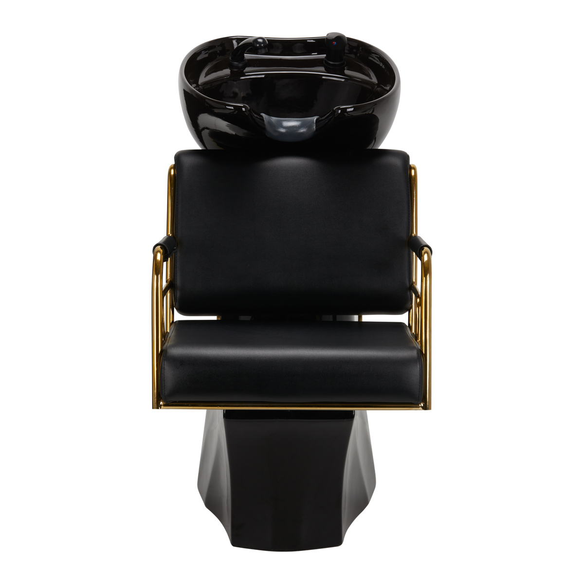 The modern Gabbiano car wash for hairdressing salons combines functionality with Italian elegance. It is made of the highest quality materials and perfectly finished. We know how important the comfort of our customers is during the treatment. That is why the special design offers a stable headrest during washing. The soft and extremely comfortable seat is covered with high-quality black eco-leather. The car wash has a white ceramic basin and golden armrests. A perfect piece of furniture for modern interiors. The golden elements are lacquered. Mechanical damage to the paintwork is excluded from the complaint.