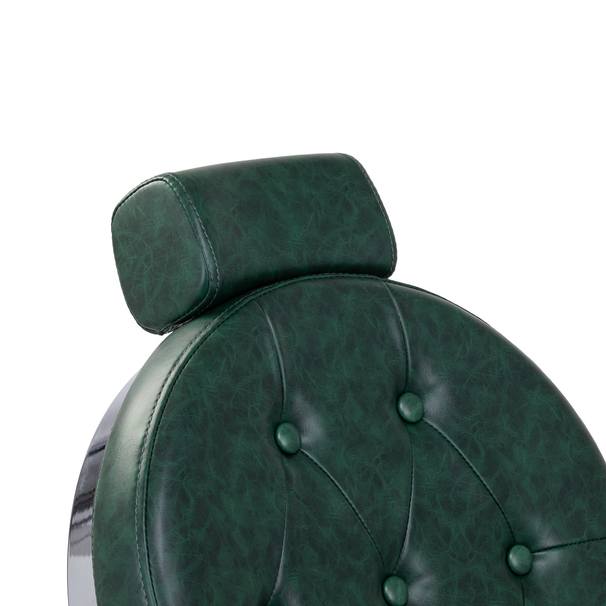 Die solide Konstruktion des Gestells sorgt für Stabilität und hohen Sitzkomfort. Die Sitzpolsterung besteht aus strapazierfähigem, formbeständigem Schaumstoff, der Bezug aus angenehm weichem Kunstleder mit seidenmattem Finish. Dies gewährleistet die Langlebigkeit und den hohen Nutzungskomfort der Möbel. Zudem sind sie feuchtigkeitsbeständig, strapazierfähig und leicht zu reinigen. Der Bezug in Grüntönen mit Steppung und Zierknöpfen verleiht ihm einen einzigartigen Charakter. Der Stuhl mit seinem charakteristischen Design im Vintage-Stil passt perfekt in die Atmosphäre von Friseursalons und unterstreicht deren einzigartiges Ambiente.