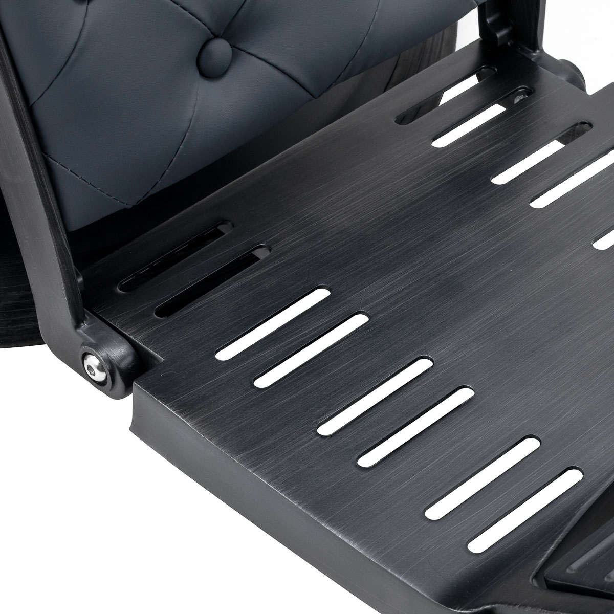 Die stabile Konstruktion des Fußes mit Elementen in Schwarztönen sorgt für hohen Sitzkomfort. Die Füllung aus langlebigem, formbeständigem Schaumstoff und der Bezug aus angenehm weichem Kunstleder gewährleisten die Langlebigkeit und den hohen Nutzungskomfort der Möbel. Sie machen die Ausstattung zudem feuchtigkeitsbeständig, strapazierfähig und pflegeleicht. Der Bezug in Graphittönen, die originelle Steppung und die Zierknöpfe verleihen ihm einen einzigartigen Charakter. Dekorative Designelemente, inspiriert von Motorrädern und im Vintage-Stil, passen perfekt zur Atmosphäre von Barbershops und schaffen deren besonderes Flair.