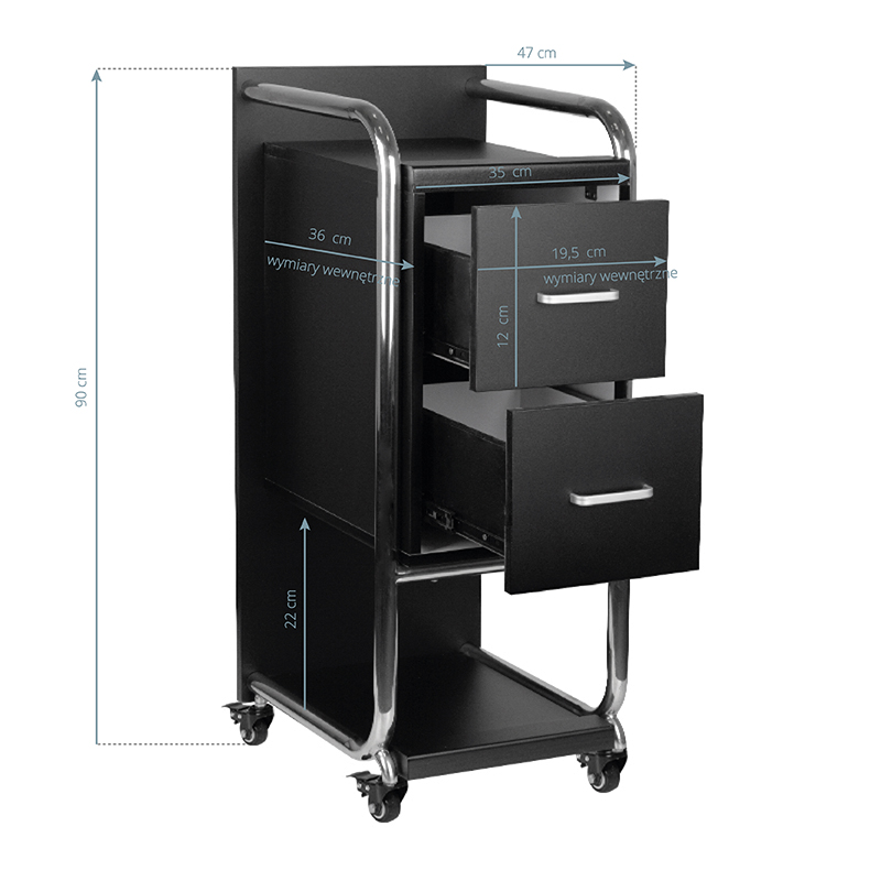 Der hochwertige Gabbiano Solo Friseurassistent ist ein elegantes Gerät, das die Arbeit im Friseursalon deutlich erleichtert. Zwei geräumige Schubladen und zwei unterschiedlich große Regalböden erleichtern die Organisation von Produkten und Werkzeugen erheblich. Gummierte Rollen mit Bremsen sorgen für ausreichende Mobilität und ermöglichen es, das Möbelstück flexibel im Friseursalon zu platzieren. Das elegante Design – polierte Metallelemente in Silbertönen und eine stabile Konstruktion aus Holzplatten in Schwarztönen – unterstreicht perfekt den Charakter des Interieurs. Die genauen Maße entnehmen Sie bitte dem Foto.