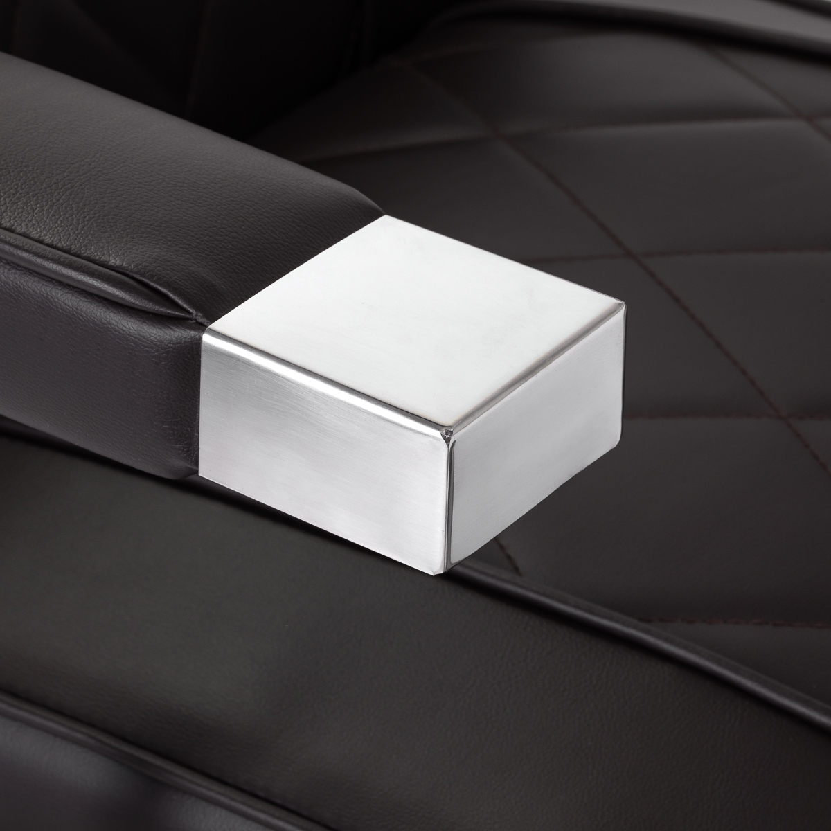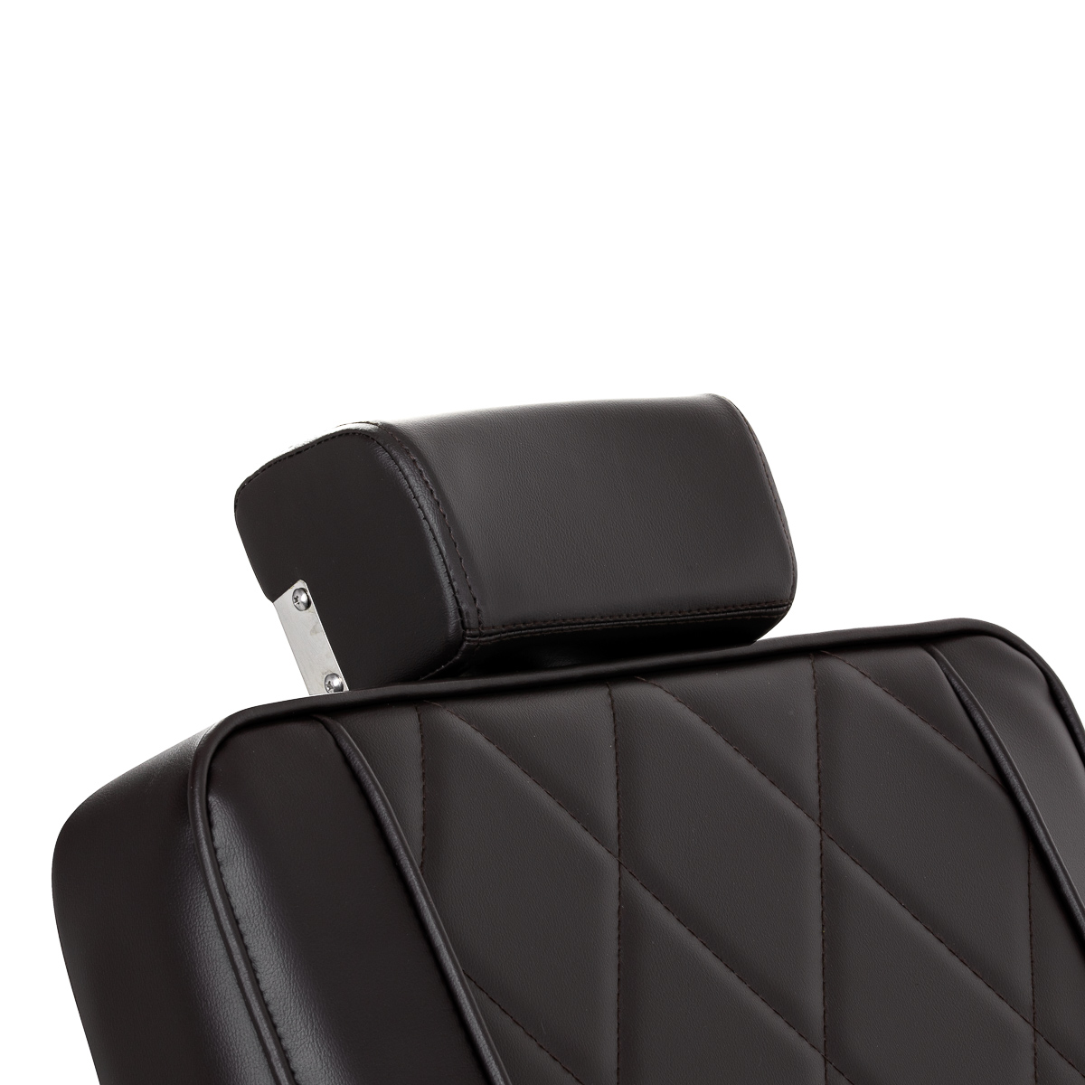 Die stabile, runde Fußkonstruktion des Stuhls gewährleistet Stabilität und hervorragenden Sitzkomfort. Die Sitzpolsterung aus formbeständigem Schaumstoff und der Bezug aus weichem Kunstleder mit matter Oberfläche garantieren Langlebigkeit und Komfort auch bei längerem Gebrauch. Stilvolle Ziernähte verleihen dem Stuhl Charakter und erinnern an Automobildesign, was seine elegante Optik unterstreicht. Diese Eigenschaft macht den Stuhl außerdem feuchtigkeitsbeständig, langlebig und leicht zu reinigen. Die braunen Polster verleihen dem Stuhl einen einzigartigen Charakter, und sein minimalistischer Stil sorgt dafür, dass er sich nahtlos in die Einrichtung jedes Friseursalons einfügt.