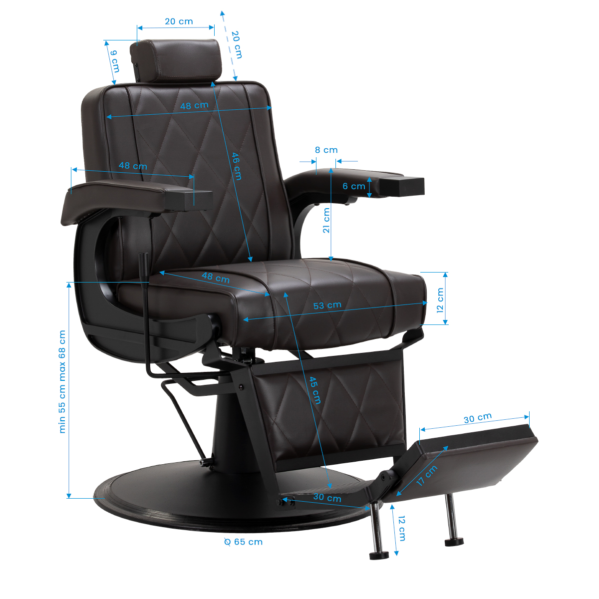 Ein effizienter hydraulischer Lift ermöglicht die stufenlose Verstellung der Sitzhöhe zwischen 55 und 68 cm, auch wenn der Kunde sitzt. Diese Funktion garantiert ergonomisches Arbeiten und ermöglicht die einfache Anpassung der Sitzhöhe an die Körpergröße von Kunde und Therapeut. Der Stuhl verfügt über eine verstellbare Rückenlehne und eine verstellbare Fußstütze, sodass der Kunde eine bequeme, halbliegende Position einnehmen kann. Diese Konfiguration gewährleistet einen besseren Zugang bei bestimmten Behandlungen. Zusätzlich bietet die 20 cm ausziehbare Kopfstütze hervorragenden Halt für den Kopf.