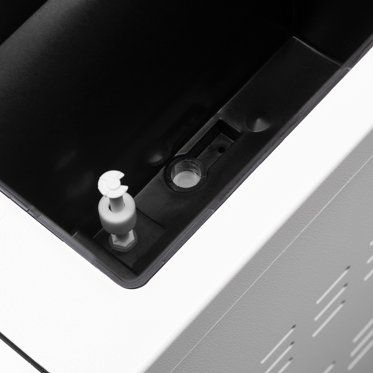 | Eingebaute Tanks für sauberes und gebrauchtes Wasser | Der Tank für sauberes Wasser ist für destilliertes oder deionisiertes Wasser zur Sterilisation vorgesehen. Dank des separaten Tanks für gebrauchtes Wasser ist kein externer Behälter erforderlich. Der Abfluss für gebrauchtes (und sauberes) Wasser befindet sich an der Vorderseite der Maschine. |