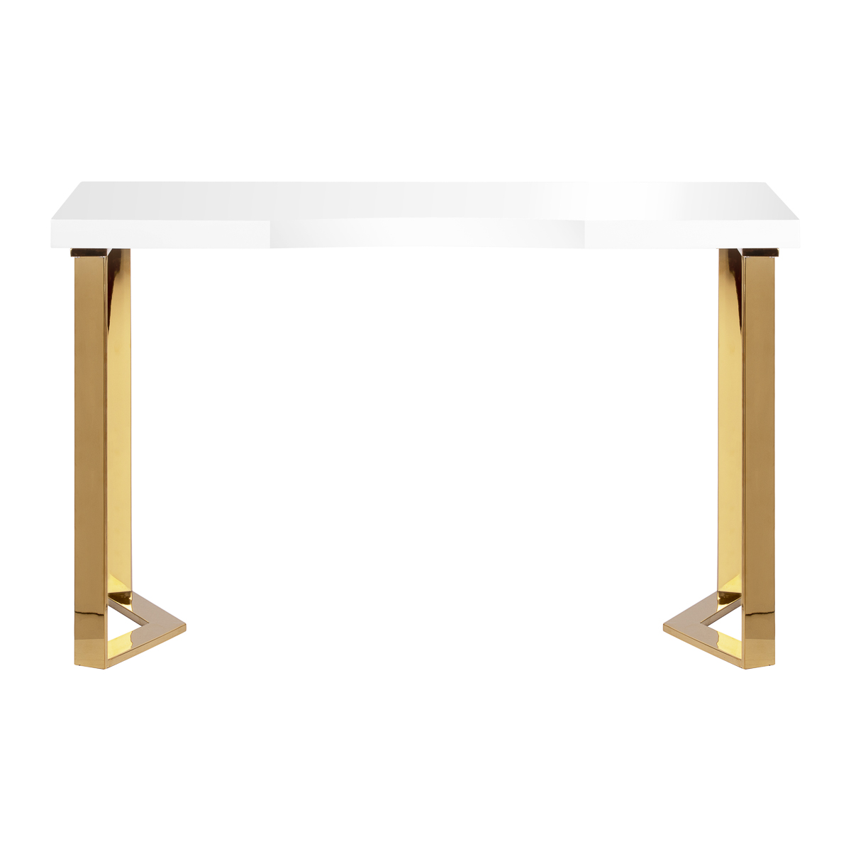 Die moderne Form des Schreibtisches, die eine weiße Tischplatte mit goldenen, geometrischen Beinen kombiniert, verleiht dem Interieur Leichtigkeit und Eleganz. Dank seiner kompakten und dennoch stilvollen Form passt der Schreibtisch perfekt sowohl in kleine Salons als auch in größere, moderne Interieurs.