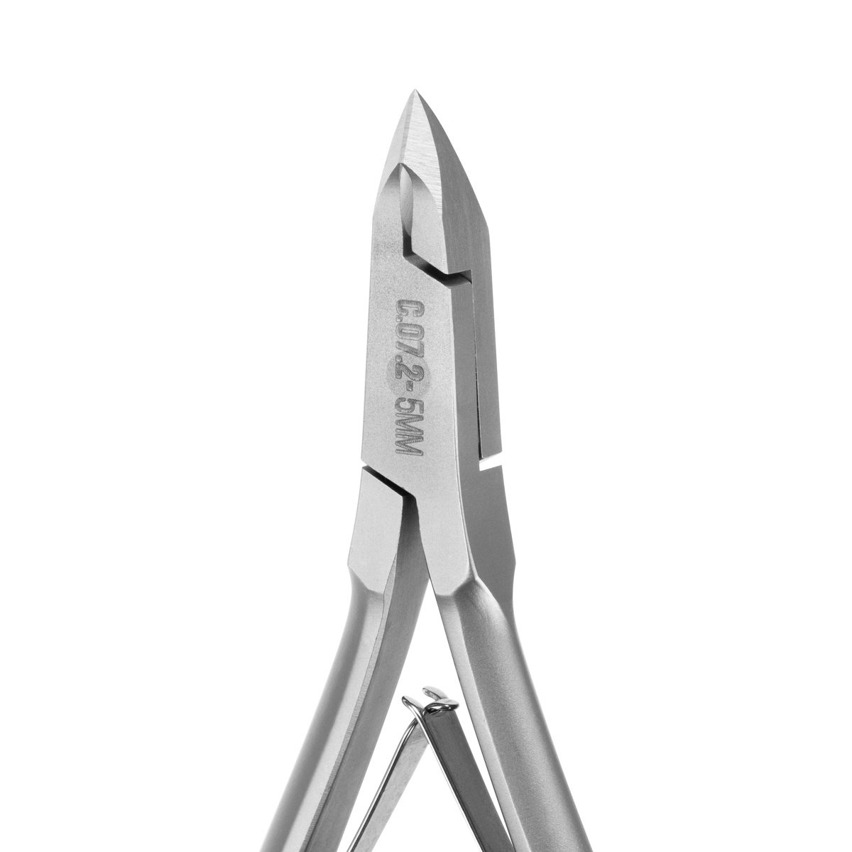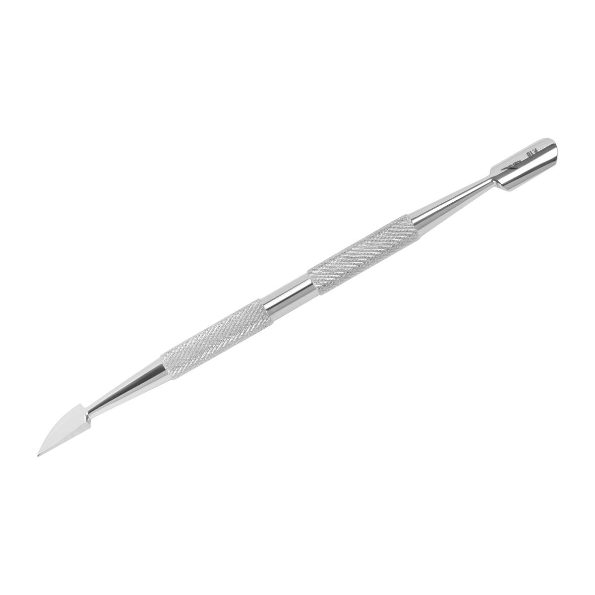 Eine Spitze ist ein abgerundeter Schieber, ideal zum Formen und Zurückschieben der Nagelhaut ohne Irritationen. Die andere Seite hat die Form eines abgeschrägten, dreieckigen Cutters, mit dem sich hartnäckige, verhornte Bereiche der Epidermis präzise entfernen lassen.