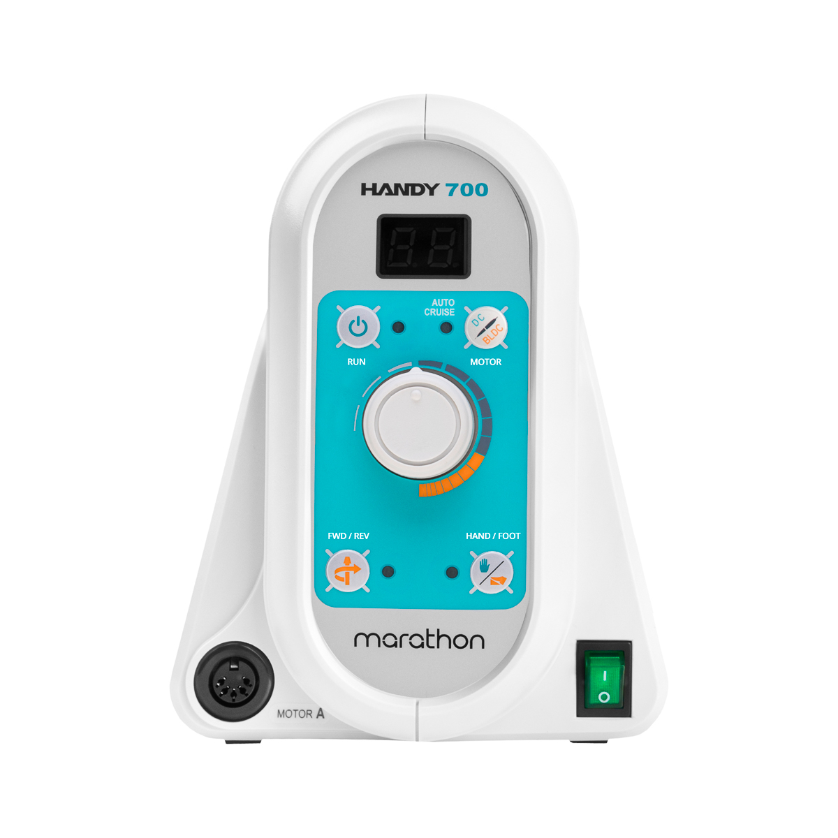 Die Nagelfräsmaschine Handy 700 für Prothesen bietet eine hohe Leistung von 100 W und einen leisen Betrieb. Sie erreicht eine hohe Drehzahl von bis zu 50.000 Umdrehungen pro Minute. Die Arbeit mit dieser Nagelfräse ist äußerst komfortabel, da der Mikromotor des Handstücks über ein integriertes Geräuschdämpfungssystem verfügt, das die Lautstärke im Vergleich zu herkömmlichen Modellen um 20 % reduziert. Das Bedienfeld der Maschine ist ergonomisch geformt und mit einem praktischen Tragegriff sowie einer Handstückhalterung ausgestattet.